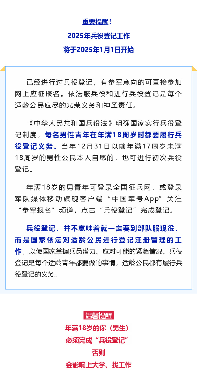 摘要:兵役登記注冊(cè)是一項(xiàng)重要的程序,旨在確保公民了解并履行兵役義務(wù)。通過(guò)登記注冊(cè),個(gè)人能夠了解兵役流程、相關(guān)政策和權(quán)利,同時(shí)也有助于國(guó)家有效管理和組織軍事力量。這一流程的重要性在于,它維護(hù)了國(guó)家的安全穩(wěn)定,并確保了適齡公民對(duì)兵役制度的了解和遵守。建議適齡公民積極參與兵役登記注冊(cè),以履行公民義務(wù)并為國(guó)家安全做出貢獻(xiàn)。
