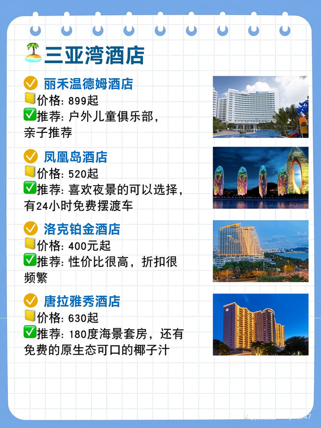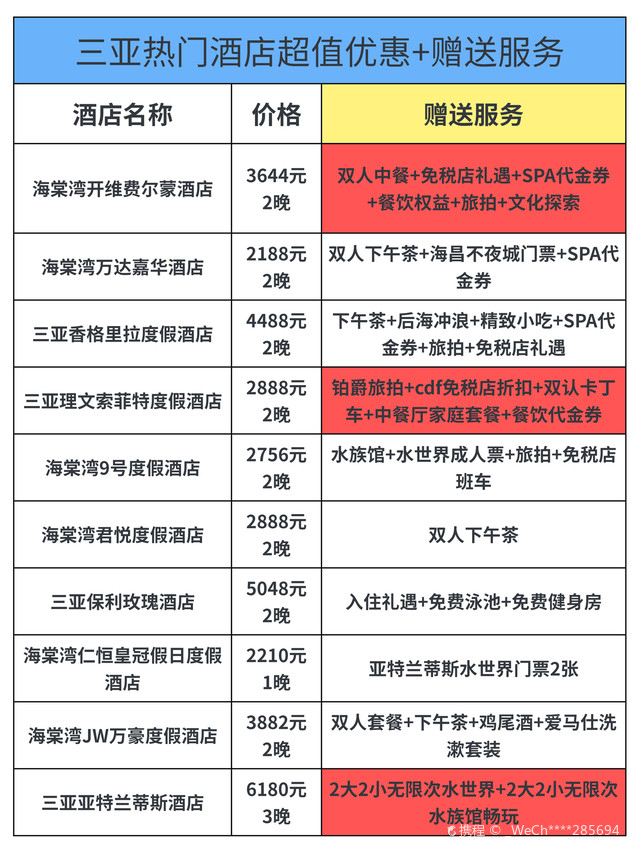 五星級房間:每晚800元至2500元人民幣不等,特色:熱帶花園、兒童俱樂部和豐富的水上活動,4. 三亞香格里拉度假酒店五星級房間:每晚1200元至3500元人民幣不等,特色:位于三亞灣,擁有私人海灘、豪華泳池和水療中心,5. 三亞亞龍灣鉑爾曼度假酒店五星級房間:每晚900元至3000元人民幣不等,特色:法式風情度假酒店,提供多種餐飲選擇和水上樂園,6. 三亞亞龍灣熱帶天堂森林公園酒店五星級至七星級房間:每晚1500元至5000元人民幣不等特色:熱帶主題酒店,擁有叢林探險、玻璃棧道等獨特體驗,7. 三亞亞龍灣人間天堂-鳥巢度假村五星級至八星級房間:每晚2000元至萬元以上人民幣不等特色:獨特的鳥巢主題客房、懸崖餐廳和豐富的戶外探險活動,8. 三亞灣紅樹林酒店五星級房間:每晚18元至人民幣不等特色:大型綜合度假勝地,擁有購物中心、博物館等配套設施,價格根據(jù)房型和預訂時間有所變動,以上價格僅供參考,具體價格還需根據(jù)季節(jié)、預訂時間和房型進行確認,在選擇酒店時,請根據(jù)您的需求和預算進行篩選,除了價格因素外,還可以關(guān)注酒店的設施、服務以及客戶評價等方面,建議您在預訂前查看酒店的官方網(wǎng)站或相關(guān)旅游平臺以獲取最新信息和優(yōu)惠活動,在享受三亞的美麗風光的同時,選擇合適的住宿將為您的旅程增添更多樂趣,無論是追求奢華體驗還是經(jīng)濟型住宿的旅客都能找到適合自己的住宿選擇,希望這份三亞酒店價格表能夠幫助您規(guī)劃一次完美的熱帶度假旅行!在您的旅途中享受陽光沙灘、美食文化以及獨特的熱帶風情吧!